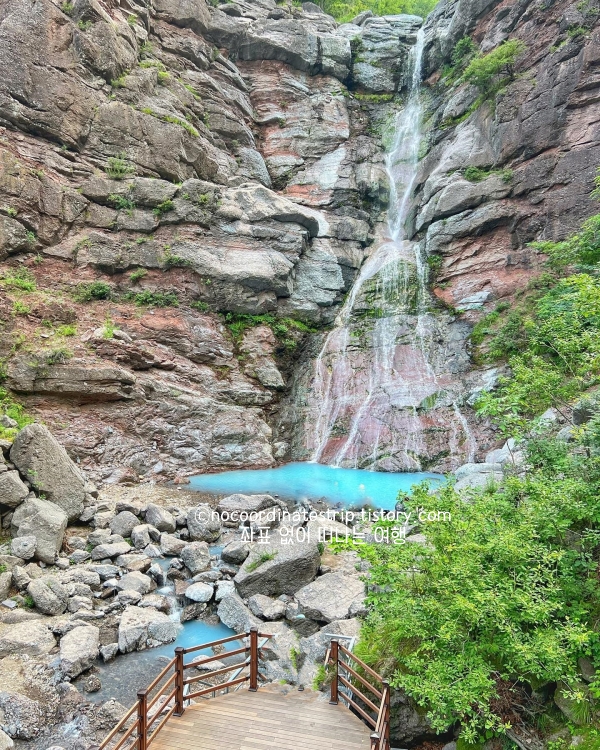 실제로 가 보니 사진보다 더 파랗게 보였고 폭포 소리와 협곡 풍경이 어우러져 감동적이었습니다. 경사가 있는 탐방로라 아이들과 함께라면 천천히 이동하는 게 좋아요. 주차 공간이 협소해 성수기에는 일찍 도착하는 게 유리하고 폭포까지 내려가는 길에 펼쳐지는 통리협곡 전망도 빼놓을 수 없는 볼거리로, 미인폭포는 그 자체로 삼척의 자연을 집약해 보여주는 명소라 ‘삼척 가볼만한곳 베스트 10 추천 명소인 것 같습니다.