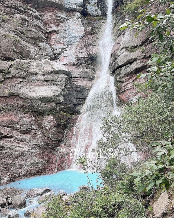 높이 약 50m의 웅장한 폭포로, 통리협곡이 빚어낸 기암괴석 사이로 하얀 물줄기가 시원하게 떨어집니다. ‘물빛이 마치 밀키스 같다’는 말이 나올 정도로 청량한 색감 덕분에 여름철 필수 여행지로 꼽히죠. 입장료는 무료이며 하절기(3~10월)는 09:00~18:00, 동절기(11~2월)는 09:00~17:00까지 관람할 수 있습니다. 주차장에서 폭포까지는 약 300m 거리로, 내리막과 흙길이 섞여 있으니 운동화 착용은 필수예요. 비가 온 직후 물빛이 더 맑아져 장마 뒤 방문하면 감탄할 만큼 아름다운 풍경을 만날 수 있습니다.