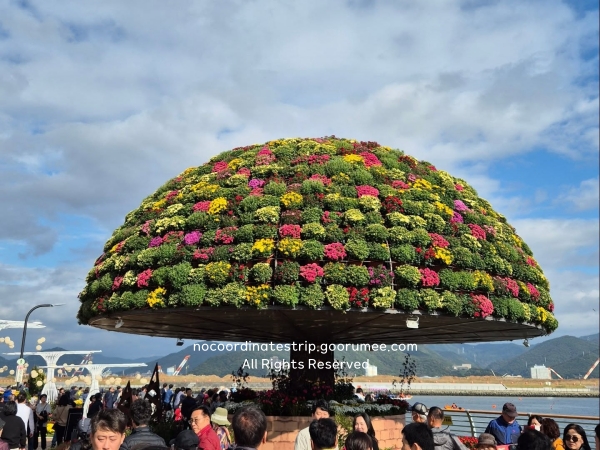 벤치에 앉아 따뜻한 커피를 마시며 국화 터널 아래로 스치는 바람을 느꼈던 기억이 생생해요. 포토존마다 사람이 몰려 있었지만, 우리만의 순간을 찾기엔 충분히 여유가 있었고 저녁 공연과 함께 펼쳐진 군악대 연주와 치어리딩 퍼레이드는 풍경에 소리를 입히고, 그 소리에 맞춰 꽃잎처럼 흩날리는 국화들이 함께 춤추는 듯합니다.