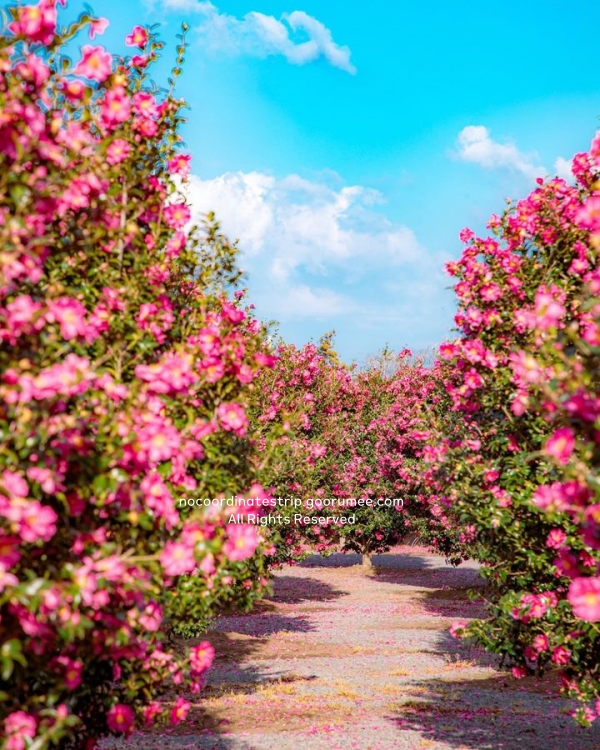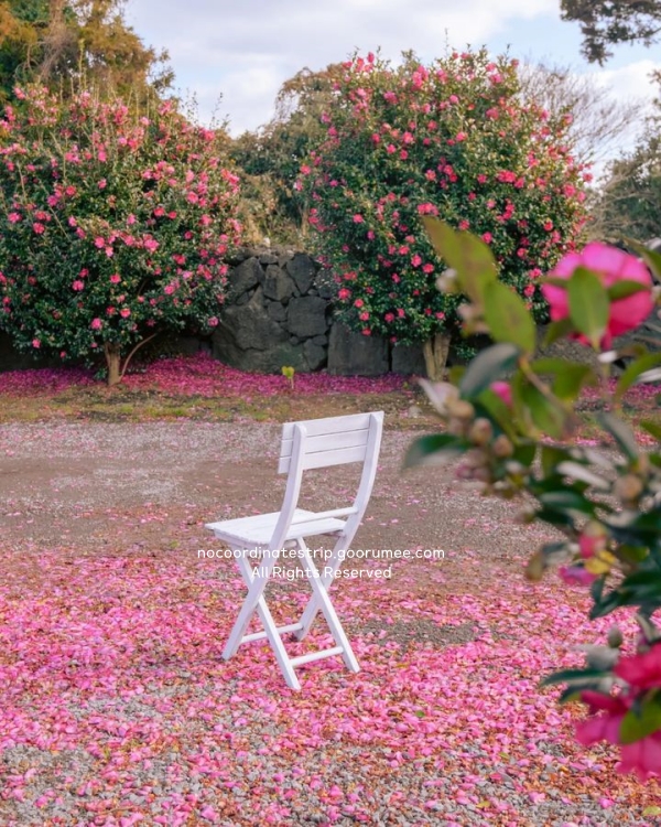 제주도 겨울 핫플레이스 사계절 꽃농원에는 붉은 동백꽃이 한창이었다. 정문 지나서 산책로를 따라 걷다 보면 작은 정자도 나오고, 꽃나무 아래로는 바람이 막혀서 오히려 더 따뜻했다. 키 큰 동백나무들 사이로 햇빛이 들면서, 가지마다 피어 있는 붉은 꽃잎들이 더 또렷하게 보였고, 땅 위엔 떨어진 꽃들이 마치 붉은 카펫처럼 깔려 있었다. 동백을 가까이에서 찍기 좋은 높이라 사진 찍기에도 딱 좋았다.