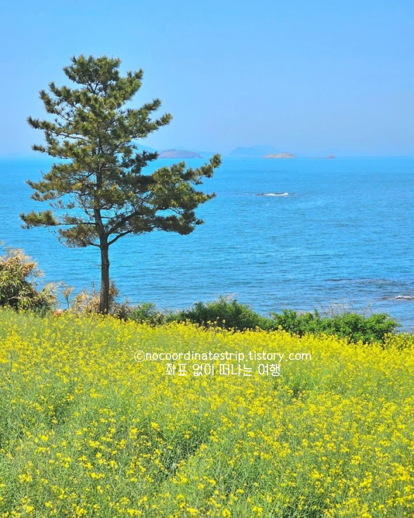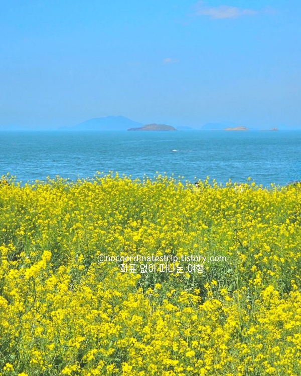 4월 중순이면 유채꽃이 거의 만개해 있고, 붐비는 명소들처럼 인파에 치이지 않아 여유 있게 둘러볼 수 있었습니다. 꽃밭 가장자리로 산책로처럼 길이 나 있어서 안쪽으로 들어가지 않아도 충분히 감상 가능하고, 바다 바람이 세지 않아 오래 머물기 좋았어요. 사진 찍기 좋은 구간은 수성당 담장 너머 바다와 꽃이 한 프레임에 들어오는 구간이었고, 짧은 일정이라도 일부러 들를 만한 가치가 있었던 4월 여행하기 좋은곳입니다.