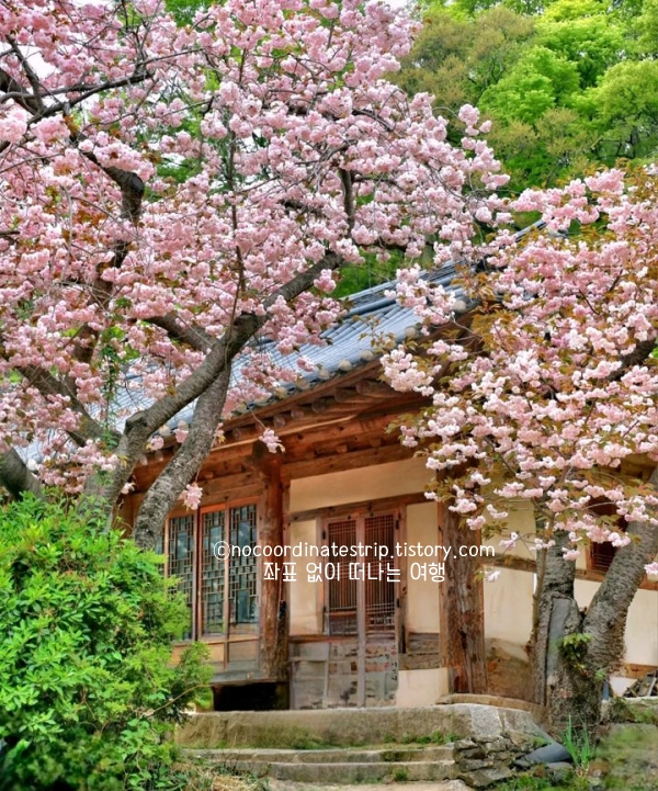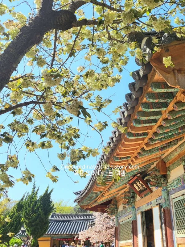 관람 포인트: 사찰 안쪽 계단 구간 / 청벚꽃은 연분홍~백색